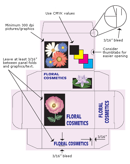 Leave at least 3/16" between text/graphics/pictures and the folds or edges of panels. This alleviates the possibility of the graphics becoming part of the panel fold, or cut off at the edge of the box. The paper can move up to 1/32" during the process of being cut down into a box after printing.